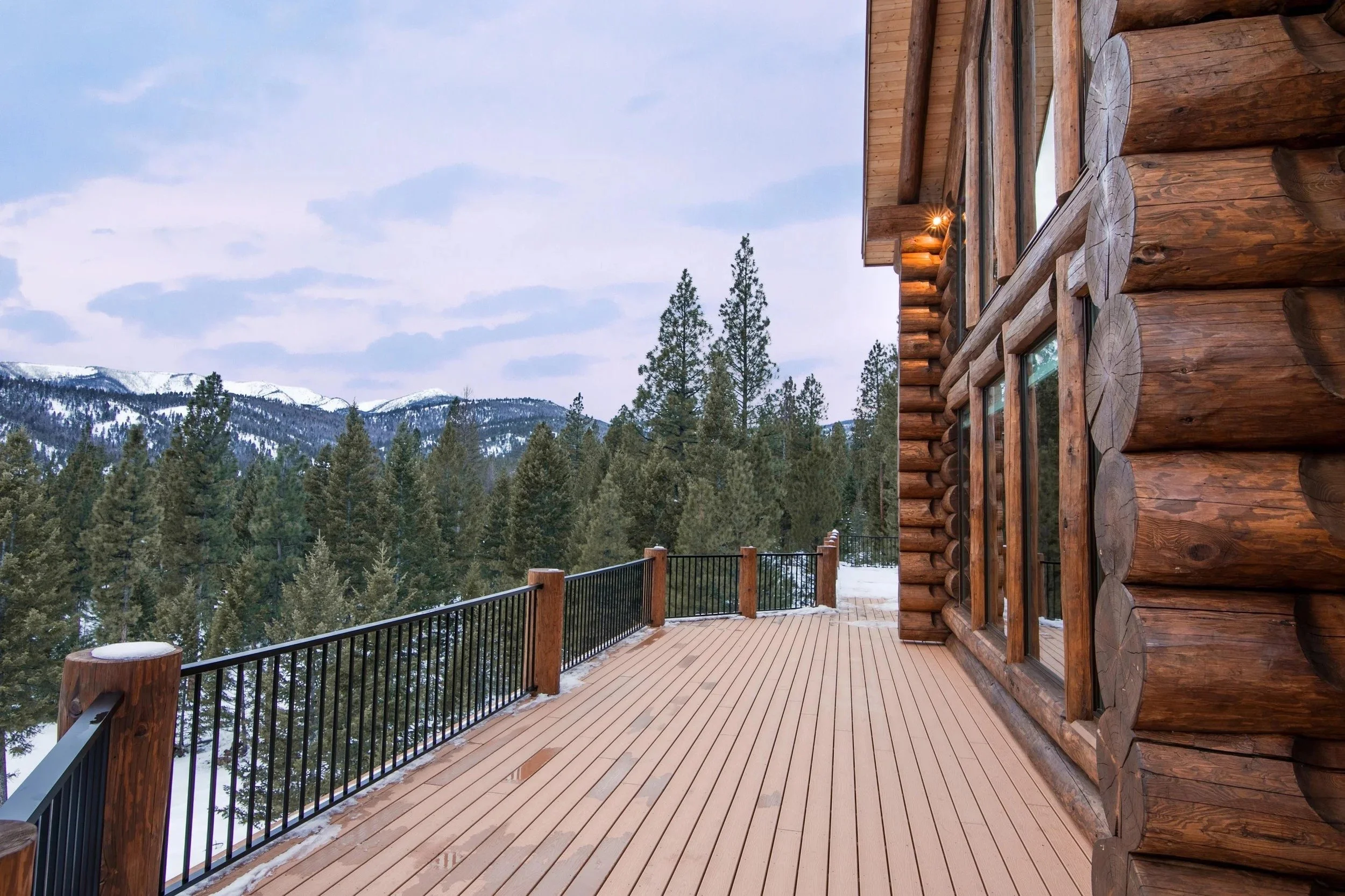 A true Montana oasis, this rustic log cabin on the outskirts of Missoula features a gourmet kitchen, striking stone fireplace, and custom nature-inspired iron railings.